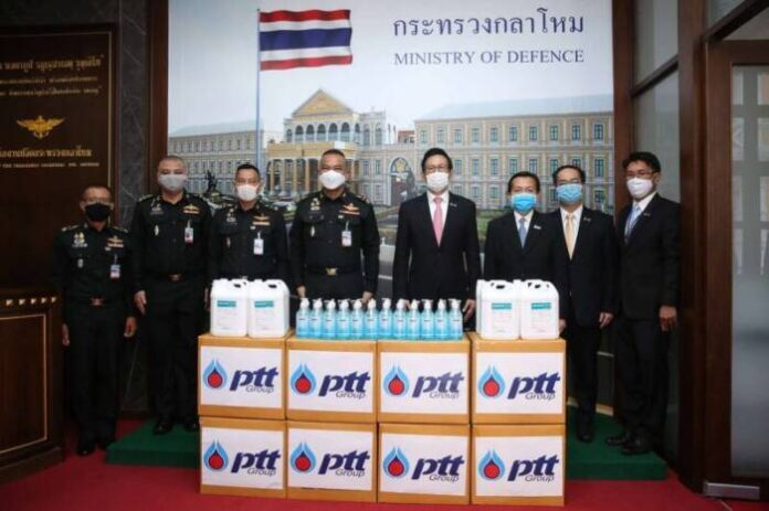 เมื่อเร็วๆ นี้ – นายอรรถพล ฤกษ์พิบูลย์ ประธานเจ้าหน้าที่ปฏิบัติการกลุ่มธุรกิจปิโตรเลียมขั้นปลาย บริษัท ปตท. จำกัด (มหาชน) (กลางขวา) พร้อมผู้บริหาร มอบแอลกอฮอล์ ซึ่งจัดหาจากโรงงานผู้ผลิตในประเทศ เนื่อง จาก ปตท. ไม่มีโรงงานผลิตแอลกอฮอล์เป็นของตนเอง ให้แก่สำนักงานปลัดกระทรวงกลาโหม โดย พลเอก ณัฐ อินทรเจริญ ปลัดกระทรวง (กลางซ้าย) เป็นผู้รับมอบ เพื่อแจกจ่ายให้แก่เจ้าหน้าที่สำนักงานปลัดกระทรวงกลาโหมและประชาชน