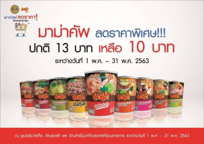 มาม่า ขานรับโครงการพาณิชย์ลดราคาช่วยประชาชน ด้วยการจัดแคมเปญพิเศษ“พาณิชย์ลดราคา ! ช่วยประชาชน ร่วมกับ มาม่าคัพ”ร่วมมือร้านค้าพันธมิตร ลดราคาบะหมี่กึ่งสำเร็จรูปมาม่าคัพทุกรสชาติ เหลือเพียง10 บาท เพื่อแบ่งเบาภาระและช่วยเหลือประชาชนในสถานการณ์การแพร่ระบาดของโรคโควิด-19