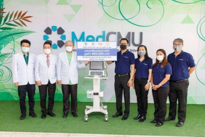 มูลนิธิเป๊ปซี่โค และ บริษัท เป๊ปซี่-โคล่า (ไทย) เทรดดิ้ง จำกัด ผู้ผลิตและจัดจำหน่ายเครื่องดื่มเป๊ปซี่ และขนมขบเคี้ยวมันฝรั่งทอดกรอบเลย์ และขนมมัลติเกรนอบกรอบ “ซันไบทส์ โดย นายชวาลา วงศ์ใหญ่ (กลาง) ผู้อำนวยการฝ่ายส่งเสริมการเกษตร ภูมิภาคเอเชีย มอบเครื่องช่วยหายใจ มูลค่า 650,000 บาท ให้แก่ โรงพยาบาลมหาราชนครเชียงใหม่ คณะแพทยศาสตร์ มหาวิทยาลัยเชียงใหม่ โดยมี ศ.คลินิก นพ.นิเวศน์ นันทจิต (ที่ 3 จากซ้าย) อธิการบดีมหาวิทยาลัยเชียงใหม่ พร้อมคณะผู้บริหารคณะแพทยศาสตร์ มช. เป็นตัวแทนรับมอบ เพื่อใช้ในการรักษาผู้ป่วยไวรัส COVID-19 และผู้ป่วยระบบทางเดินหายใจ เมื่อเร็วๆ นี้