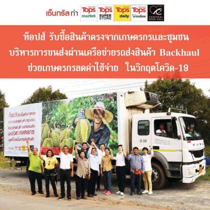 เซ็นทรัล ฟู้ด รีเทล ผู้บริหารท็อปส์ และ แฟมิลี่มาร์ท ในเครือเซ็นทรัล รีเทล ตอกย้ำวิสัยทัศน์ ตามที่กลุ่มเซ็นทรัลเสนอนโยบายต่อรัฐบาล มุ่งเน้นความรับผิดชอบสังคม บูรณาการขับเคลื่อนเศรษฐกิจอย่างยั่งยืน ผ่านมาตรการสร้างอาชีพ เสริมรายได้ เปิดตัวโครงการ “รับซื้อสินค้าตรงจากเกษตรกรและชุมชน บริหารการขนส่งผ่านเครือข่ายรถส่งสินค้า(Backhaul)” โดยใช้ประโยชน์สูงสุดจากระบบโลจิสติกส์ ช่วยเหลือเกษตรกรทั่วประเทศลดค่าใช้จ่ายในการขนส่งสินค้า ใช้พลังงานอย่างคุ้มค่า บูรณาการให้เกิดความยั่งยืนกับเกษตรกรและเศรษฐกิจของไทยก้าวผ่านวิกฤตโควิด-19