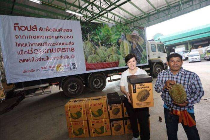 ด้านคุณวิชาญ สายแก้ว เกษตรกรผู้ผลิตทุเรียนหมอนทอง สวนอุดมทรัพย์ กล่าวเสริมถึงการได้รับความสะดวกมากขึ้นหลังเข้าร่วมโครงการในช่วงโควิด-19 ว่า “ผลผลิตของผมคือ ทุเรียน ซึ่งจะปลูกเฉพาะทุเรียนหมอนทองเพียงอย่างเดียว โดยจะมีการส่งออกทุเรียนไปที่จีนเป็นส่วนใหญ่ รวมถึงขายภายในประเทศ ซึ่งผมก็จะมีวิธีดูแลผลผลิตให้ได้คุณภาพตามมาตรฐาน มีการจัดบันทึกวันดอกบาน วันเก็บเกี่ยว หลังจากเก็บเกี่ยวผลผลิตจากในสวนแล้ว ก็จะนำมารวบรวมไว้ที่วิสาหกิจชุมชนชาวสวนทุเรียนจันท์ เพื่อขนส่งทางรถยนต์ไปจำหน่าย พอเกิดสถานการณ์การแพร่ระบาดของไวรัสโควิด-19 ก็เริ่มมีความกังวลว่าจะส่งสินค้าไปขายได้อย่างไร แต่พอมีโครงการของท็อปส์เข้ามาช่วยเหลืออย่างถูกเวลาพอดี ทำให้เราสะดวกสบายมากขึ้นในการจัดการเรื่องขนส่งผลผลิต เพราะปกติเราจะขับรถข้ามจังหวัดไปส่งเองในกรุงเทพฯ แต่ตอนนี้ก็ได้การบริหารจัดการรถขนส่งของท็อปส์มาช่วยอำนวยความสะดวก ทำให้แม้จะมีการจำกัดเวลาเดินทาง แต่เราก็ยังสามารถนำผลผลิตของเราส่งออกไปจำหน่ายได้ และทำให้ลดการแพร่ระบาดของไวรัสโควิด-19 ได้อีกทางหนึ่งด้วย”
