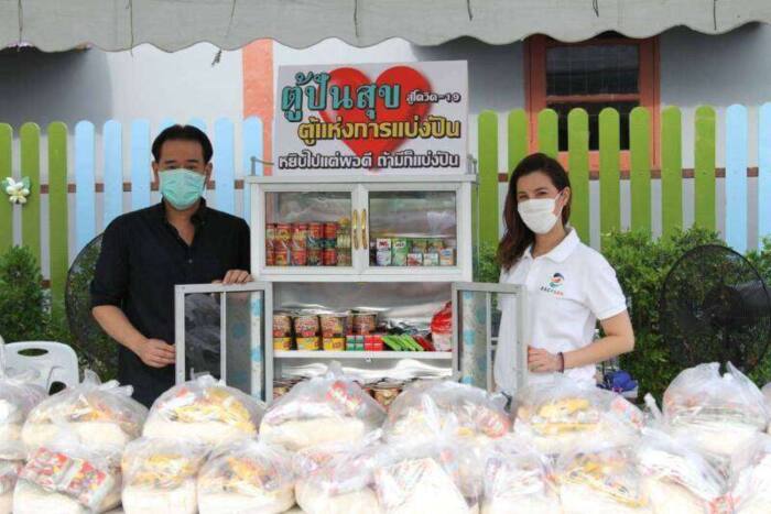 ด้านดาราสาวใจบุญ “ธัญญ่า ธัญญาเรศ” ได้กล่าวเสริมว่า “ก่อนหน้านี้พี่กับน้องกี้ (สินีนารถ เองตระกูล) ก็ได้นำทีมพนักงาน “บีบีคลินิก” ไปบริจาคโลหิตที่สภากาชาดไทย และไปส่งเสบียงพร้อมนำเงินไปบริจาคให้กับโรงพยาบาลหลายแห่ง วันนี้ก็ดีใจที่ได้มาช่วยพี่เป๊กบริจาคสิ่งของให้กับคนในชุมชนนี้ ก็ตั้งใจว่าจะพยายามช่วยเหลือชาวบ้านที่เดือดร้อนให้มากขึ้นเท่าที่จะทำได้ อย่างวันนี้เราก็ตั้งใจทำ “ตู้ปันสุข” ให้เค้าด้วย ก็หวังว่าคนในชุมชนแถวนี้จะร่วมแรงร่วมใจปันสุขให้แก่กันไปพร้อมกับเราด้วย”