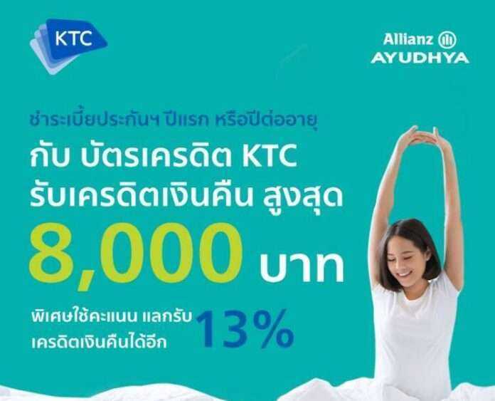 บัตรเครดิต KTC ร่วมกับ อลิอันซ์ อยุธยา ประกันชีวิต และ อลิอันซ์ อยุธยา ประกันภัย มอบความสุขพร้อมรับความคุ้มครองให้ลูกค้าคนสำคัญ เมื่อชำระเบี้ยกันชีวิต หรือเบี้ยประกันภัยทุกประเภท ทั้งเบี้ยปีแรก และปีต่ออายุ (ยกเว้นกรมธรรม์ประกันชีวิตแบบยูนิต ลิงค์) ผ่านบัตรเครดิต KTC รับสิทธิประโยชน์ 2 ชั้น ชั้นที่ 1 รับเครดิตเงินคืนสูงสุด 8,000 บาท สูงสุด 1,000 บาท ต่อเดือน ตลอดรายการ ชั้นที่ 2 แลกคะแนน KTC FOREVER ทุก 1,000 คะแนน เพื่อรับเครดิตเงินคืนได้ถึง 13% ตั้งแต่วันนี้ – 31 ธ.ค. 63 เท่านั้น ทั้งนี้เงื่อนไขเป็นไปตามที่ บริษัท บัตรกรุงไทย จำกัด ผู้ให้บริการ บัตรเครดิต KTC กำหนด ดูรายละเอียดเพิ่มเติมได้ที่