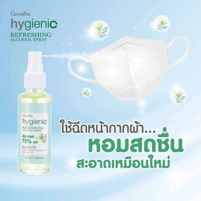 กิฟฟารีน ขอแนะนำ ผลิตภัณฑ์ กิฟฟารีน ไฮจีนิค รีเฟรชชิ่ง แอลกอฮอล์ สเปรย์ (Giffarine Hygienic Refreshing Alcohol Spray) สเปรย์สำหรับฉีดหน้ากากผ้า ตัวเลือกที่เหนือกว่าด้านสุขอนามัยส่วนตัว สำหรับทุกคน ด้วยส่วนผสมจากธรรมชาติ และแอลกอฮอล์คุณภาพระดับ Food Grade 75% ช่วยฆ่าเชื้อโรคได้เต็ม ประสิทธิภาพปราศจากเมทิลแอลกอฮอล์ที่เป็นอันตรายต่อสุขภาพ ให้ความปลอดภัย ไม่ระคายเคืองผิว ลดปัญหากลิ่นไม่พึงประสงค์มาพร้อมกลิ่นหอมสะอาดสดชื่นจาก น้ำมันหอมระเหย เปปเปอร์มิ้นท์ (Peppermint Oil), น้ำมันหอมระเหยยูคาลิปตัส (Eucalyptus oil) และน้ำมันหอมระเหย สเปียร์มินท์ (Spearmint Oil) พกพาง่าย ขนาดกะทัดรัด ด้วยขนาด 50 มิลลิลิตร ราคา 99 บาท สามารถใช้ได้ทุกที่ เพียงวางหน้ากากผ้า บนกระดาษทิชชู่ที่สะอาด ฉีดสเปรย์ 1-2 ครั้ง ด้านในหน้ากากผ้า และวางทิ้งไว้ 10 นาที ในช่วงเวลาที่พักจากการสวมใส่หน้ากาก หรือ ในช่วงเวลาที่รับประทานอาหาร และไม่ได้ใส่หน้ากาก