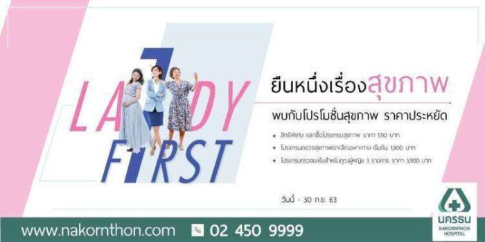 โรงพยาบาลนครธน โรงพยาบาลเฉพาะทางที่ดีที่สุดในย่านพระราม 2 มุ่งมั่นพัฒนาการรักษาเพื่อดูแลทุกชีวิตในครอบครัว พร้อมส่งมอบสุขภาพดีให้คุณแม่และคุณผู้หญิงด้วยโปรโมชั่น “Lady First” ยืนหนึ่งเรื่องสุขภาพ เพราะสุขภาพของคุณผู้หญิงต้องมาเป็นที่หนึ่ง อาทิ โปรแกรมตรวจสุขภาพ Lady First 14 รายการ ราคา 2,900 บาท รับสิทธิ์เลือกตรวจโปรแกรมสุขภาพเฉพาะทาง ราคา 590 บาท (เฉพาะรายการที่กำหนด) โปรแกรมตรวจมะเร็งสำหรับคุณผู้หญิง 3 รายการ ราคา 5,900 บาท โปรแกรมฝากครรภ์คุณภาพเพื่อคุณแม่และลูกน้อย ราคา 12,500 บาท และ โปรแกรมตรวจสุขภาพเฉพาะทาง เริ่มต้น 1,900 บาท เป็นต้น นอกจากนี้ยังมีโปรโมชั่นพิเศษเพื่อสุขภาพและความงามของผู้หญิงอีกมากมาย สำหรับผู้ที่สนใจสามารถซื้อโปรโมชั่นสุดพิเศษนี้ได้ตั้งแต่วันนี้ถึง 30กันยายน 2563 สอบถามรายละเอียดเพิ่มเติมได้ที่ 02-450-9999