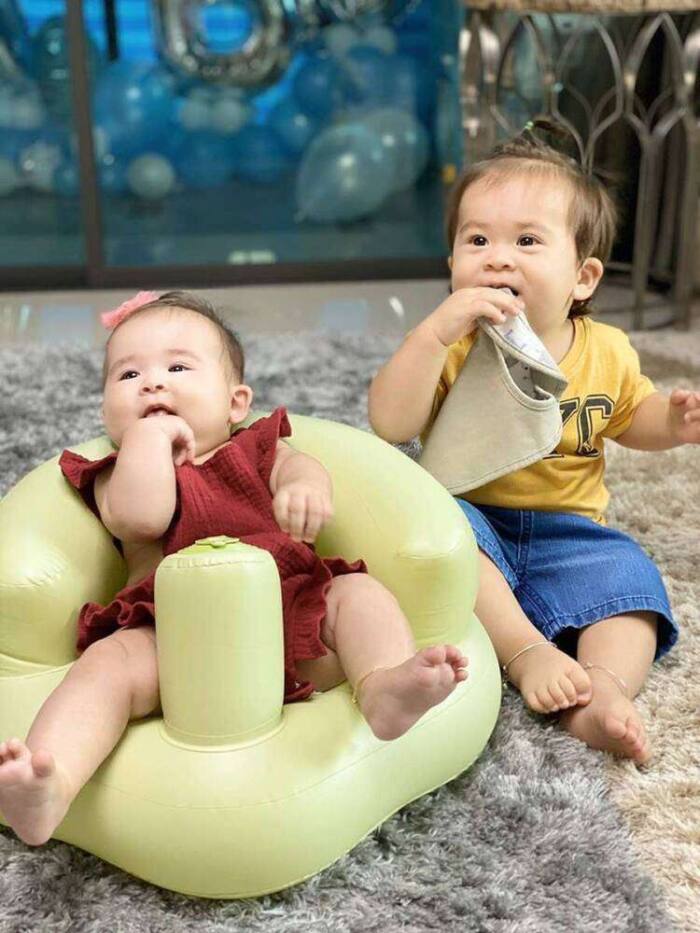 พัฒนาการน้องฉลาดทั้งคู่เลย คนหนึ่งคือ “พีชฟูล” คือน้องแองเจลิก้าลูกสาว ส่วนอีกคนนึงคือ “เพลย์ฟูล” คือลูกชาย น้องแอนดรูว์ น้องแองเจลิก้าก็จะไนซ์มาก จะสวีท คือจะแบบหวานหวาน อยู่ด้วยแล้วมีความรู้สึกว่าเหมือนเลี้ยงตุ๊กตาหมีเลย ลูกชายก็จะน่ารักตามวัย ยังพูดไม่ได้แต่เดินเก่งมาก อายุเพียง 1 ปี 4 เดือน ก็สูง 92 เซ็นติเมตรแล้ว ลูกสาวก็จะสูงใกล้กันแล้ว ทั้งที่ห่างกันประมาณ 8 เดือน เรามีความรู้สึกว่าพัฒนาการทางด้านร่างกายเค้าโตเร็วมาก ส่วนการพูดเนี่ยก็คงจะเร็วเร็วนี้ เขาก็เริ่มประสมคำแล้ว เริ่มสั่งอะไรเริ่มรู้การแล้ว เอ็นจอยในฐานะเป็นแม่คน แล้วก็ยังตื่นเต้นอยู่เลย ว่าเราเป็นแม่คนแล้วจริงจริงนะ