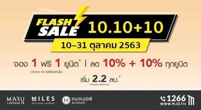 24 กันยายน 2563, – บริษัท เมเจอร์ ดีเวลลอปเม้นท์ จำกัด (มหาชน) หรือ MJD ออกแคมเปญแรง Flash Sale 10.10 + 10 กระตุ้นการตัดสินใจซื้อ เพิ่มยอดขายไตรมาส 4 กับคอนโดสร้างเสร็จพร้อมอยู่ และคอนโดเปิดใหม่ เชื่อมั่นตลาดยังมีเรียลดีมานด์ สำหรับคอนโดทำเลแนวรถไฟฟ้า ใกล้แหล่งความสะดวกสบายและแหล่งออฟฟิศทำงาน