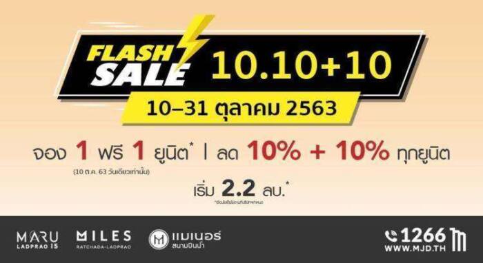 แคมเปญ Flash Sale 10.10 + 10 นี้ เป็นแคมเปญส่งเสริมการขายในช่วงเวลาพิเศษ ที่มอบส่วนลดมากกว่าส่วน ลดปกติ ลดราคาหนัก 10% จากราคาปกติทุกยูนิต* โดยถือฤกษ์วันที่ 10 เดือน 10 ตั้งแต่ 10 – 31 ตุลาคม 2563 สำหรับโครงการ มารุ ลาดพร้าว 15 คอนโดสร้างเสร็จพร้อมอยู่ ห่างจากสถานีรถไฟฟ้าใต้ดินสถานีลาดพร้าว เพียง 50 เมตร ราคาเริ่มต้น 4.7 ล้านบาท* และโครงการไมลส์ รัชดา – ลาดพร้าว โครงการ Fully Furnished คอนโดแต่งครบ ห่างจาก สถานีรถไฟฟ้าใต้ดินสถานีลาดพร้าวและสถานีอินเตอร์เชนจ์สายสีเหลือง เพียง 550 เมตร คอนโด Low -rise โครงการแรกของเมเจอร์ฯ ที่เพิ่งเปิดตัว Grand Opening ไปเมื่อ 12 – 13 กันยายน ที่ผ่านมา ต่อโปรโมชั่นลด 10% ต่อเนื่อง ลดราคาหนักทั้ง 2 โครงการ แถมต่อที่ 2 ลดเพิ่มอีก 10% จากราคาที่ลดแล้ว ราคาเริ่มต้น 2.20 ล้านบาท* เงื่อนไขพิเศษสุดนี้มีจำนวนจำกัด และระยะเวลาตามที่กำหนดเท่านั้น
