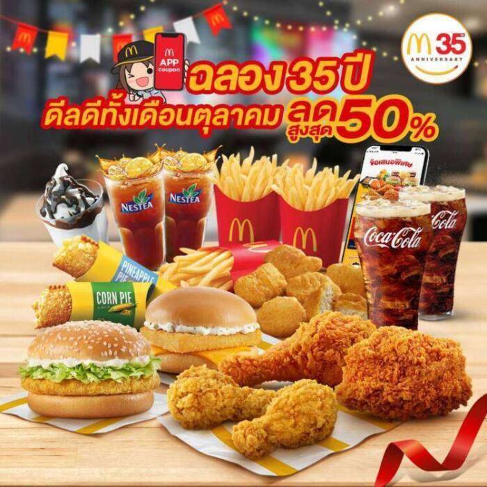 ร่วมฉลองครบรอบ 35ปี แมคโดนัลด์ ประเทศไทย ตอบแทนความผูกพันที่ไม่เคยเปลี่ยนแปลง มอบสิทธิพิเศษในรูปแบบคูปอง เพียงดาวน์โหลด แมคโดนัลด์ แอปพลิเคชัน (McDonald’s Application) กดรับสิทธิ์ และแสดงคูปองกับพนักงานที่ร้านแมคโดนัลด์ทุกสาขาที่ร่วมรายการ ทั้งนั่งทานที่ร้าน, ซื้อกลับบ้าน และไดรฟ์ ทรู อิ่มคุ้มไม่ซ้ำวันกับหลากหลายโปรโมชั่น ตลอดเดือนตุลาคมนี้