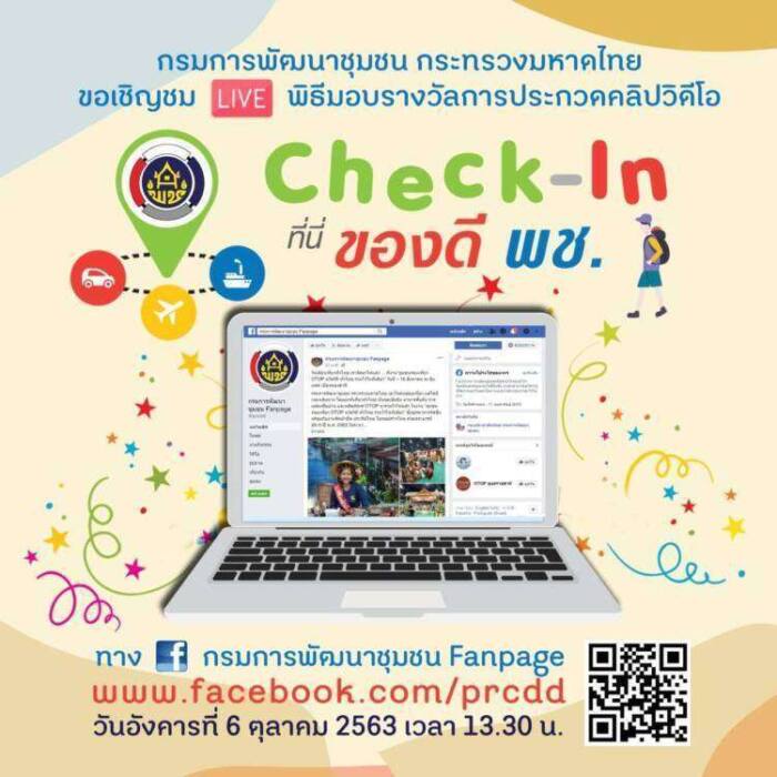 กรมการพัฒนาชุมชน ประกาศผลประกวดคลิป “Check-in ที่นี่ของดี พช.” คัด 34 ผลงานโดดเด่นของนักเรียน นักศึกษา ประชาชน และบุคลากร พช. มีไอเดียสร้างสรรค์นำเสนอเรื่องราวสุดประทับใจ พร้อมเตรียมมอบรางวัล 6 ต.ค. 63 นี้