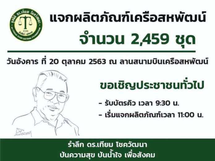 มูลนิธิ ดร.เทียม โชควัฒนา ร่วมกับ บริษัทในเครือสหพัฒน์ เชิญชวนประชาชน รับสินค้าอุปโภคบริโภค ฟรี!! 2,459 ชุด ที่ลานสนามบินเครือสหพัฒน์ ศรีราชา