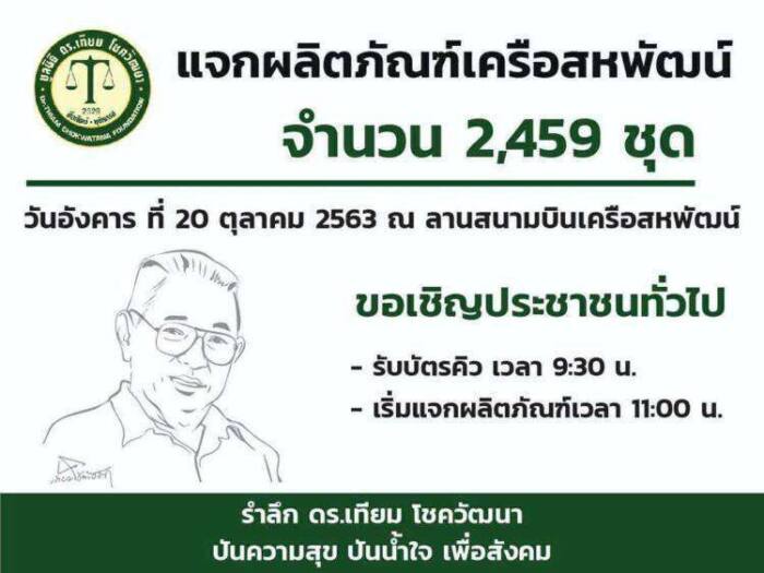 มูลนิธิ ดร.เทียม โชควัฒนา ร่วมกับ บริษัทในเครือสหพัฒน์ ขอเชิญประชาชนรับชุดผลิตภัณฑ์เครือสหพัฒน์ ฟรี ในโอกาสรำลึกถึง ดร.เทียม โชควัฒนา ผู้ก่อตั้งเครือสหพัฒน์ และเป็นการบรรเทาความเดือนร้อนของประชาชนจากสถานการณ์การแพร่ระบาดของโควิด-19 แต่ละชุดประกอบด้วยสินค้าอุปโภคบริโภคต่างๆ รวมทั้งสิ้น 2,459 ชุด โดยจะมีการแจกใน วันที่ 20 ตุลาคม 2563 ณ ลานสนามบินเครือสหพัฒน์ ศรีราชาเปิดให้รับบัตรคิวเวลา 09.30 น. และเริ่มแจกผลิตภัณฑ์เวลา 11.00 น.