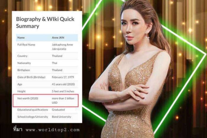 ทุกปีเว็บไซต์ด้านธุรกิจรวมถึงเซเลบริตี้ที่มีชื่อเสียง จะมีการจัดอันดับนักธุรกิจที่ประสบความสำเร็จทั่วโลกในบ้านเราต้องขอแสดงความยินดีกับ “คุณแอน – จักรพงษ์ จักราจุฑาธิบดิ์” ประธานเจ้าหน้าที่บริหารและกรรมการผู้จัดการ บริษัท เจเคเอ็น โกลบอล มีเดีย จำกัด (มหาชน) หรือ JKN ผู้นำการจัดจำหน่ายลิขสิทธิ์คอนเทนต์ระดับโลก ที่ก้าวสู่ ผู้หญิงข้ามเพศที่รวยที่สุดในเอเชีย และเป็นอันดับสามของโลก โดยมีทรัพย์สินและเงินสดมากกว่าหนึ่งพันล้านเหรียญสหรัฐ ข้อมูลจาก www.worldtop2.com