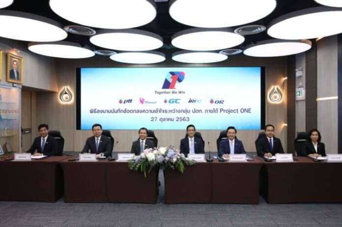 เมื่อเร็วๆ นี้ – นายอรรถพล ฤกษ์พิบูลย์ ประธานเจ้าหน้าที่บริหารและกรรมการผู้จัดการใหญ่ และ นาย กฤษณ์ อิ่มแสง ประธานเจ้าหน้าที่ปฏิบัติการกลุ่มธุรกิจปิโตรเลียมขั้นปลาย ร่วมเป็นประธาน และสักขีพยานในพิธีลงนามบันทึกข้อตกลงความเข้าใจระหว่างกลุ่ม ปตท. ภายใต้ Project ONE โดยมี นายวิรัตน์ เอื้อนฤมิต ประธานเจ้าหน้าที่บริหารและกรรมการผู้จัดการใหญ่ บริษัท ไทยออยล์ จำกัด (มหาชน) นายคงกระพัน อินทรแจ้ง ประธานเจ้าหน้าที่บริหาร บริษัท พีทีที โกลบอลเคมิคอล จำกัด (มหาชน) นายนพดล ปิ่นสุภา ประธานเจ้าหน้าที่บริหารและกรรมการผู้จัดการใหญ่ บริษัท ไออาร์พีซี จำกัด (มหาชน) น.ส.จิราพร ขาวสวัสดิ์ ประธานเจ้าหน้าที่บริหารและกรรมการผู้จัดการใหญ่ บริษัท ปตท. น้ำมันและการค้าปลีก จำกัด (มหาชน) และนายดิษทัต ปันยารชุน รองกรรมการผู้จัดการใหญ่หน่วยธุรกิจการค้าระหว่างประเทศ บริษัท ปตท. จำกัด (มหาชน) เป็นผู้ร่วมลงนามในบันทึกข้อตกลงฯ