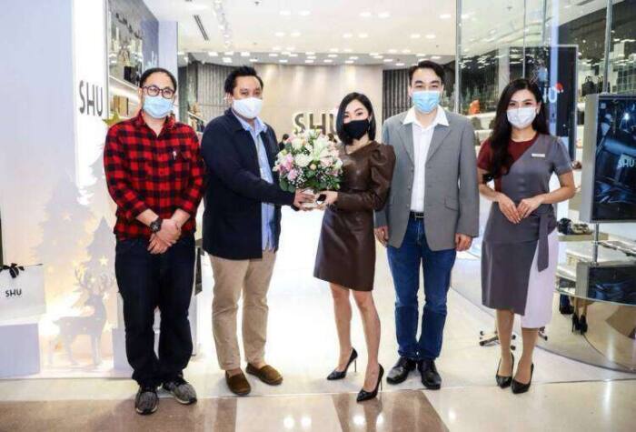 คุณกรกนก สว่างรวมโชค (ที่ 3 จากซ้าย) และ คุณวิชัย นุกูลวุฒิโอภาส (ที่ 4 จากซ้าย) ประธานเจ้าหน้าที่บริหาร บริษัท ชู โกลบอล จำกัด รับมอบดอกไม้แสดงความยินดีจาก คุณปารเมศ วรธำรง (ที่ 2 จากซ้าย) ผู้ช่วยผู้อำนวยการ ศูนย์การค้าเซ็นทรัลพลาซา ศาลายา ในโอกาสที่ SHU (ชู) ได้เปิดสาขาใหม่ ณ ชั้น 1 โซน TOPs ศูนย์การค้าเซ็นทรัลพลาซา ศาลายา เมื่อเร็วๆนี้