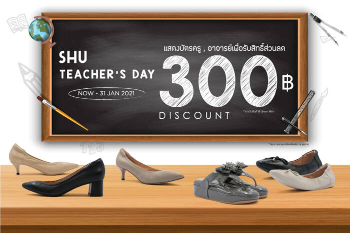 สวัสดีคุณครู SHU มีโปรดีดีมาฝาก กับ SHU Teacher’s Day เพียงแสดงบัตรครู อาจารย์ รับส่วนลดไปเลยทันที 300 บาท เพื่อคุณครูที่รัก SHU อยากให้ครูได้ใส่รองเท้าดีๆ เราจึงมอบสิทธิพิเศษให้คุณครูทั่วประเทศ สินค้าร่วมรายการทุกรุ่น รวมทั้ง SHU SOFASHOES SLIM SWEET CHIC ไอเทมพิเศษขายดีอันดับ 1 (ยกเว้น SOFASHOES color of the Month “Green MINT”และ สินค้าลดราคาพิเศษ) รีบจัดด่วน ที่ SHU STORES ทุกสาขา และ ทาง ONLINE ตั้งแต่วันนี้ ถึง 31 มกราคม 2564