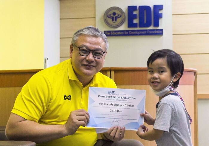 มูลนิธิ EDF (มูลนิธิกองทุนการศึกษาเพื่อการพัฒนา) โดยนายสำเริง รัตนคช ผู้จัดการฝ่ายประชาสัมพันธ์ ถ่ายภาพร่วมกับเด็กชายกฤต อภิชาติธนพัฒน์ หรือน้องนิค ในโอกาสที่น้องนิคมอบเงิน 25,000 บาท (สองหมื่นห้าพันบาทถ้วน) จากการจำหน่าย “แอสการ์ดคุ๊กกี้” คุกกี้ที่ทำขึ้นเป็นพิเศษร่วมกับครอบครัวในวันเกิดอายุครบ 4 ปี เพื่อสนับ สนุนเป็นทุนการศึกษาให้นักเรียนพิการเรียนร่วมชั้นเรียนปรกติในปีการศึกษา 2564 จำนวน 5 ทุน