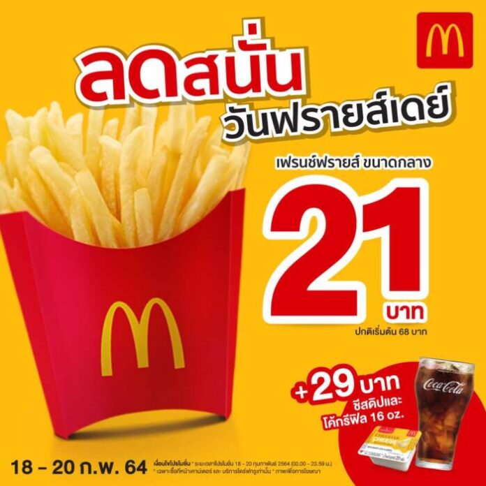 แมคโดนัลด์ จัดโปรลดสนั่นวันฟรายส์เดย์ อร่อยสนุกกับเฟรนช์ฟรายส์ขนาดกลาง (M) ราคาพิเศษเพียง 21 บาท (จากราคาปกติเริ่มต้น 68 บาท) พิเศษ! เพิ่มเพียง 29 บาท ก็ได้อร่อยเป็นเซตพร้อมชีสดิป หรือ ค็อกเทลดิป 1 กล่อง และเครื่องดื่มโค้กรีฟิลขนาด 16 ออนซ์ 1 แก้ว สุขสุดสุดปักหมุดพร้อมกันเฉพาะวันที่ 18 – 20 กุมภาพันธ์ 2564 นี้ 3 วันเท่านั้น ที่แมคโดนัลด์สาขาที่ร่วมรายการทั่วประเทศ ทั้งแบบนั่งทานที่ร้าน, ซื้อกลับบ้าน และบริการไดรฟ์ ทรู อร่อยไม่ต้องลงจากรถ ยกเว้นสาขา ปตท. มอเตอร์เวย์ขาเข้า-ขาออก, เกาะพีพี, อิมแพ็คเมืองทองธานี , คิดส์ซาเนีย และทุกสาขาในสนามบิน, สำหรับบริการจัดส่งอาหารถึงบ้านและแมคดิลิเวอรีไม่ร่วมรายการ เช็คสาขาได้ที่ https://www.mcdonalds.co.th/faq ข้อมูลเพิ่มเติมคลิก www.facebook.com/mcthai