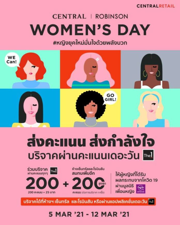 ต้อนรับวันสตรีสากล 8 มีนาคม ห้างเซ็นทรัล และห้างโรบินสัน ในเครือเซ็นทรัล รีเทล ผนึกกำลังจัดแคมเปญ ‘CENTRAL / ROBINSON WOMEN’S DAY’(เซ็นทรัล และ โรบินสัน วีเมนส์ เดย์) สร้างพลังบวกครั้งใหญ่สู่สังคม ชวนนักช้อปส่งคะแนน ส่งกำลังใจ แก่ผู้หญิงที่ได้รับผลกระทบจากโควิด-19 ทั่วประเทศ ผ่าน ‘มูลนิธิเพื่อนหญิง’ ตั้งแต่วันที่ 5 – 12 มีนาคม 2564 ที่ห้างเซ็นทรัล (ยกเว้นสาขาจังซีลอน) และโรบินสัน (ยกเว้นสาขาจังซีลอน ป่าตอง) หรือผ่านแอปพลิเคชั่นเดอะวัน พร้อมจับมือแบรนด์สินค้าผู้หญิงชั้นนำ จัดดีลโปรโมชั่นสุดพิเศษมากมายทั้งหน้าร้าน และออนไลน์