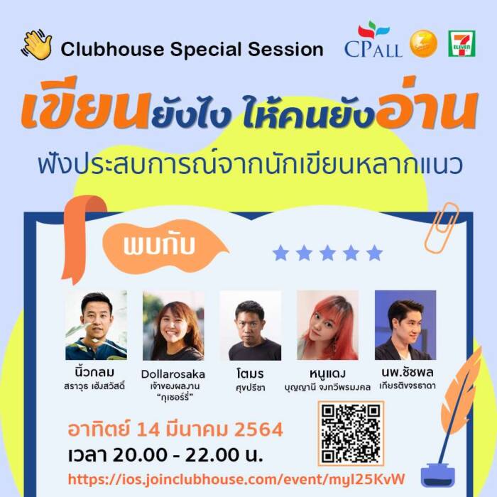 เซเว่นบุ๊คอวอร์ด โดย บมจ. ซีพี ออลล์ จัดกิจกรรมพิเศษClubhouse Special Session ชวนไปฟังเหล่านักเขียนมากประสบการณ์ หลากหลายแนว ร่วมกันหาคำตอบว่าในยุคที่ทุกสิ่งแย่งเวลากัน แล้ว “เขียนยังไง ให้คนยังอ่าน” พบกับ “นิ้วกลม” สราวุธ เฮ้งสวัสดิ์, Dollarosaka เจ้าของผลงาน ”กุเชอร์รี่”, โตมร ศุขปรีชา, “หนูแดง” บุญญาณี จงทวีพรมงคล และ นพ.ชัชพล เกียรติขจรธาดา