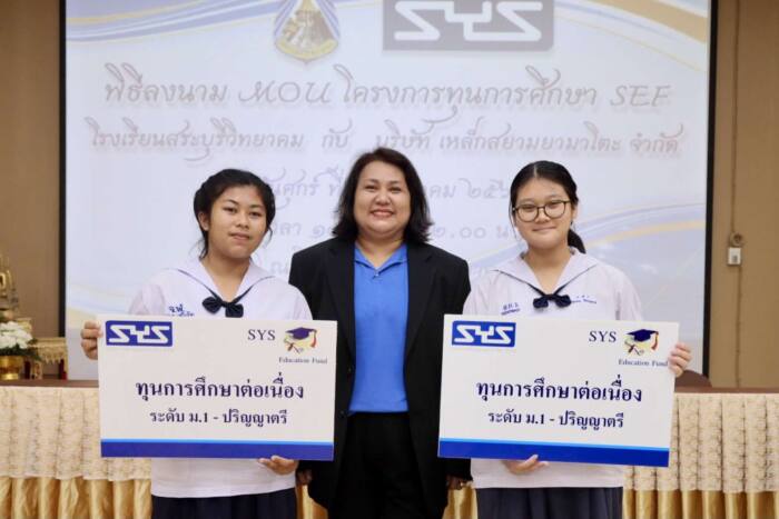 (สระบุรี, ประเทศไทย): นางรัชนากรณ์ วิริยานนท์ (กลาง) ผู้จัดการตรวจสอบภายใน บริษัท เหล็กสยามยามาโตะ จำกัด หรือ SYS ผู้ผลิตเหล็กเอชบีม ไวด์แฟลงก์ มานานมากกว่า 25 ปี มอบทุนการศึกษาให้กับนักเรียนทุนในโครงการ SYS Education Fund (SEF) ประจำปี 2564 จำนวน 2 ทุน ได้แก่ ด.ญ.ธันย์ชนก เสถียรโชค (ซ้าย) ชั้น ม.3 โรงเรียนวัดจุฬามณี (ชุณหะจันทนประชาสรรค์) จ.พระนครศรีอยุธยา และ ด.ญ.กชพรรณ ดีประหลาด (ขวา) ชั้น ม.3 โรงเรียนสระบุรีวิทยาคม จ.สระบุรี ซึ่งเป็นทุนการศึกษาเรียนต่อเนื่องตั้งแต่มัธยมศึกษาจนจบปริญญาตรี โดยเป็นทุนให้เปล่า ไม่ต้องชดใช้ทุนคืนให้แก่ SYS แต่อย่างใด ณ โรงเรียนสระบุรีวิทยาคม ต.ปากเพรียว อ.เมืองสระบุรี จ.สระบุรี เมื่อไม่นานมานี้