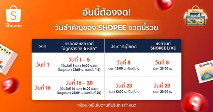 อันนี้ต้องจดวันสำคัญของคนดวงดี ในแคมเปญ “Shopee งวดนี้รวย” เก็บหวย ชิงเงินล้าน