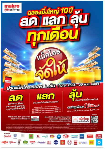 นางซันนี่ ซิดิค ผู้บริหารสูงสุด สายงานบริหารสินค้า บริษัท สยามแม็คโคร จำกัด (มหาชน) กล่าวว่า “ด้วยพันธกิจในการเป็นมิตรแท้โชห่วย เป็นคู่คิดธุรกิจให้กับผู้ประกอการรายย่อย แม็คโคร จึงได้ร่วมกับพันธมิตรทางการค้าจัดแคมเปญ ‘แม็คโคร จัดให้’ขึ้นเมื่อ 10 ปีที่แล้วจนถึงปัจจุบัน เพื่อนำเสนอสินค้าราคาพิเศษที่จะช่วยเพิ่มสมรรถนะทางการแข่งขันและตอบโจทย์ความต้องการของผู้ประกอบการที่เป็นสมาชิก ‘แม็คโคร จัดให้’ สำหรับปีนี้ แม้จะอยู่ในช่วงสถานการณ์แห่งความยากลำบากและการแพร่ระบาดของโควิด-19 รอบ 3 แม็คโครและพันธมิตรทางธุรกิจ ยังคงเดินหน้าจัดแคมเปญเพื่อลดภาระต้นทุนให้ผู้ประกอบการ ในระหว่างวันที่ 1 เมษายนจนถึง 30 พฤศจิกายน 2564 ภายใต้คอนเซ็ปต์‘ฉลองยิ่งใหญ่ 10 ปี ลด แลก ลุ้น ทุกเดือน ผ่านแม็คโครแอปพลิเคชั่น’ ให้สิทธิประโยชน์ถึง 3 ต่อ คือ การลดราคาสินค้าพิเศษ การแลกรับบัตรกำนัลอิเล็กทรอนิกส์ และร่วมลุ้นรางวัลมากมาย”