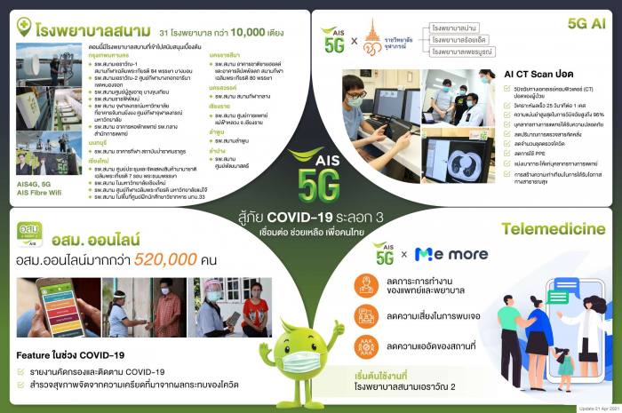 - โรงพยาบาลสนาม ติดตั้งเครือข่าย AIS 5G ,4G, Free Wifi ในโรงพยาบาลสนามหลักกว่า 31 แห่ง มากกว่า 10,000 เตียง ทั่วประเทศ เพื่อให้บุคลากรทางการแพทย์ทำงานได้อย่างเต็มประสิทธิภาพ เช่น เชื่อมต่อระบบ CCTV เพื่อเฝ้าระวังผู้ป่วย, การส่งต่อข้อมูลการแพทย์ ตลอดจนให้ผู้ป่วยที่กักตัวสามารถสื่อสาร ติดตามข่าวคราวความเคลื่อนไหวให้คลายความกังวล มีกำลังใจในการฟื้นฟูสุขภาพ