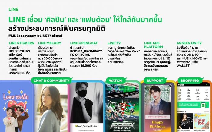 แพลตฟอร์มอย่างแอปฯ LINE ซึ่งคนไทยคุ้นชินใช้เป็นเครื่องมือสื่อสารในชีวิตประจำวัน ก็มี Ecosystem 6 ฟีเจอร์และบริการเพื่อขับเคลื่อนกลไกแฟนด้อมเกิดเป็น Convergence Experience ประสบการณ์อินฟินได้ครบทุกมิติ ตั้งแต่ Watch , Chat & Community, Support และ Shopping