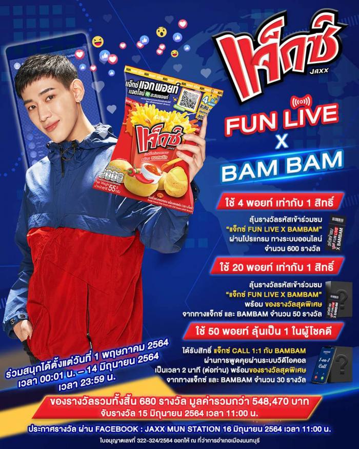 สำหรับกิจกรรม “แจ็กซ์ FUN LIVE x BAMBAM” (แจ็กซ์ ฟัน ไลฟ์ เอ็กซ์ แบมแบม) ทุกคนสามารถร่วมสนุกได้ง่ายๆ โดยการสมัครเป็นสมาชิกผ่าน Line Official Account แจ็กซ์แจกพอยท์ (@Jaxx) เท่านั้น โดยสะสมพอยท์และสามารถใช้พอยท์แลกรับสิทธิ์ลุ้นเป็นผู้โชคดีเข้าร่วมกิจกรรมออนไลน์ “แจ็กซ์ FUN LIVE x BAMBAM” ความพิเศษยังไม่หมดเท่านี้ แจ็กซ์ ยังจัดรางวัลสุดพิเศษสานฝันให้ได้ใกล้ชิด กับแบมแบม มากกว่าใครเข้าไปอีก กับ แจ็กซ์ Call 1:1 กับ BAMBAM ผ่านการพูดคุยผ่านระบบวีดิโอคอล เป็นเวลา 2 นาที อีกด้วยขอย้ำ รางวัลนี้มีจำนวนจำกัด!!!!