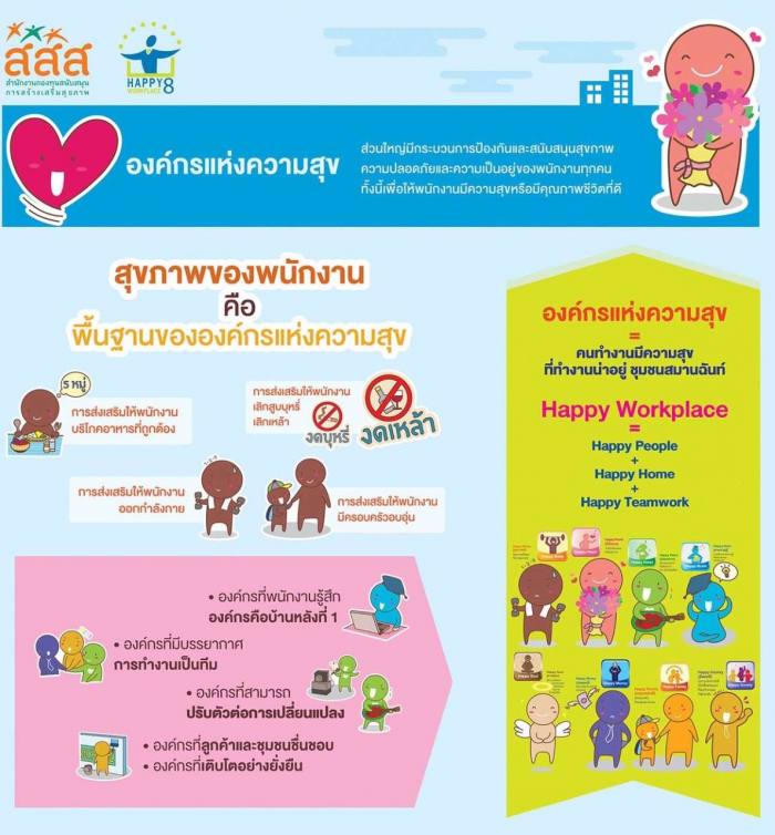 นายวุฒิชัย ประชาพร ผู้อำนวยการกองพัฒนาขีดความสามารถธุรกิจอุตสาหกรรม กรมส่งเสริมอุตสาหกรรม กล่าวว่า ที่ผ่านมา กรมส่งเสริมอุตสาหกรรม ร่วมกับ สสส. ขับเคลื่อนโครงการสุขภาวะแรงงานในวิสาหกิจขนาดกลางและขนาดย่อม (SMEs) ผลสำเร็จจากการใช้นวัตกรรมแนวคิด Happy Workplace ในการดำเนินโครงการ ทำให้เกิดองค์กรสุขภาวะ 274 แห่ง มีนักสร้างสุของค์กร 2,600 คน ศูนย์สนับสนุนการเรียนรู้การสร้างสุขภาวะองค์กร 12 แห่ง และเครือข่ายสนับสนุนสร้างสุขภาวะคนทำงานใน SMEs 255 หน่วยงาน นอกจากนี้ สถานประกอบการ 749 แห่ง ยังได้เข้าร่วมอบรมหลักสูตรพัฒนาผู้ประกอบการสร้างความสุขในองค์กร ที่สำคัญกระทรวงการคลังอนุมัติข้อเสนอลดหย่อนภาษี 2 เท่า ให้บริษัทที่ส่งเสริมสุขภาพและป้องกันโรคคนวัยทำงานในสถานประกอบการ ขณะนี้ เตรียมเสนอให้มีรางวัลอุตสาหกรรมดีเด่น ประเภทองค์กรแห่งความสุขครั้งแรกของไทยเข้าสู่การพิจารณา ซึ่งจากการวิเคราะห์ผลตอบแทนทางสังคม (SROI) ลงทุน 1 บาท ให้ผลตอบแทนทางสังคม 7 บาท สะท้อนแรงงานไทยมีความสุขมากขึ้น