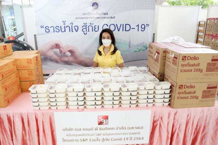 คุณมณีสุดา ศิลาอ่อน ผู้อำนวยการสำนักพัฒนาความยั่งยืนและสื่อสารองค์กร บริษัท เอส แอนด์ พี ซินดิเคท จำกัด (มหาชน) กล่าวว่า “ท่ามกลางสถานการณ์การแพร่ระบาดของโควิด-19 ระลอกใหม่นี้ เอส แอนด์ พี ขอเป็นส่วนหนึ่งในการสนับสนุนอาหารปลอดภัย เพื่อให้กำลังใจบุคลากรทางการแพทย์ผู้เสียสละและทุ่มเทในการรักษาผู้ป่วยโรคโควิด-19 ด้วยการส่งมอบผลิตภัณฑ์เอส แอนด์ พี ได้แก่ อาหารกล่อง อาหารแช่แข็ง ผลิตภัณฑ์คุกกี้เอส แอนด์ พี คุกกี้เดลิโอ บัทเทอร์เค้กซอง เค้กกล้วยหอม ขนมข้อไก่เนยสด เจลิโอเจลลี่ และน้ำดื่ม มูลค่ารวมทั้งสิ้น 4,191,238 บาท ให้แก่โรงพยาบาล และโรงพยาบาลสนามในภูมิภาคต่างๆ ทั่วประเทศ