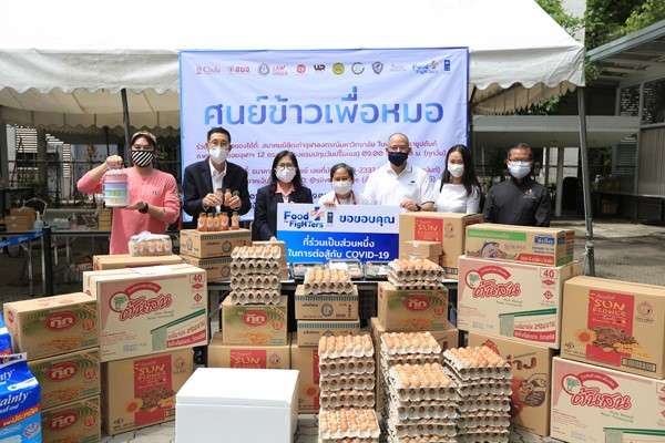 ขณะที่ นางสาวพันชนะ วัฒนเสถียร ผู้ก่อตั้งโครงการฟู้ด ฟอร์ ไฟเตอร์ (FFF) กล่าวว่า ตลอดปีที่ผ่านมา เรามีเครือข่ายอาสาสมัครของ FFF อยู่ในแต่ละจังหวัดพร้อมเป็นสื่อกลางรับอาหารและสิ่งของอุปโภค เพื่อนำมากระจายให้ทั่วถึงอย่างเป็นระบบ ภายใต้แนวคิด ‘รับจากส่วนที่เกิน – เติมเต็มและส่งต่อส่วนที่ขาด’ จนสามารถส่งต่อให้ถึงมือผู้ต้องการความช่วยเหลือทั้งโรงพยาบาล หน่วยงานภาครัฐ เอกชน องค์กรสาธารณกุศลตามแต่ละท้องที่ได้อย่างรวดเร็ว และเมื่อกรุงเทพฯ เกิดวิกฤตต้องตั้ง รพ.สนาม และดูแลชุมชนแออัดหลายแห่ง เราจึงนำแนวคิดเดียวกันนี้มาใช้เปิดศูนย์ข้าวเพื่อหมอ กรุงเทพฯ โดยได้รับความอนุเคราะห์จากสมาคมนิสิตเก่าจุฬาฯ เปิดพื้นที่สมาคมใจกลางเมืองหลวงเป็นจุดศูนย์กลางรับบริจาค ขนถ่าย กระจายอาหารและสิ่งของที่จำเป็น เร่งกู้สถานการณ์ให้คลี่คลายเร็วที่สุด ซึ่งในวันนี้เป็นวันแรกที่เราเปิดศูนย์ที่นี่ได้มีธารน้ำใจจากองค์กรภาคีเครือข่ายหลั่งไหลส่งวัตถุดิบเพื่อจัดทำอาหารกล่องและถุงยังชีพเข้ามาอย่างต่อเนื่อง ซึ่งเราได้ทยอยลำเลียงส่งต่อไปยังหลายพื้นที่ อาทิ ชุมชนคลองเตย ชุมชนบ่อนไก่ ชุมชนสวนแก้ว (ทางรถไฟสายเก่า) เป็นต้น