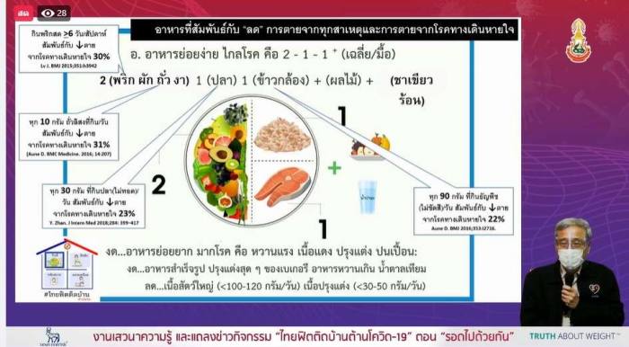 ด้าน ผศ.นพ.สมเกียรติ แสงวัฒนาโรจน์ กรรมการเครือข่ายคนไทยไร้พุง กล่าวว่า การดูแลสุขภาพให้ห่างไกลโควิด-19 ควรอาศัยองค์ความรู้ทางตะวันตก ผสมผสานกับองค์ความรู้ไทยโบราณ โดยการ “อยู่บ้าน กินดี มีขยับ” เป็นทางออกทางเลือกที่ดี ดังนี้ 1.กินดี คือกินแบบไทยโบราณผสมผสานกับอาหารเมดิเตอร์เรเนียน รูปแบบกินอาหารจาน 2:1:1 โดย กิน “ผัก พริก ถั่ว งา” 2 ส่วน “ปลา (ไม่ทอด)” 1 ส่วน และ “ข้าวกล้อง” 1 ส่วน เสริมด้วยผลไม้จานเล็ก ทุกมื้อหลังอาหาร 2.มีขยับ คือ ลดนั่ง เพิ่มยืน-เดิน ไม่เพลิน นั่งกิน นอนกิน จนน้ำหนักขึ้น เข็มขัดคับ ความดันโลหิตสูง นอกจากนี้ แต่ละวันควรเดินเกิน 7,000 ก้าว เสริมด้วย เดินเร็ว 3,000 ก้าวใน 30 นาที (นาทีละ 100 ก้าวติดต่อกันครึ่งชั่วโมง) หรือการออกกำลังกาย ทั้งแอโรบิก แบบมีแรงต้าน หรือ เพิ่มความยืดหยุ่น มีประโยชน์ในการป้องกันโรคทั้งนั้น การดูแลอื่นๆ เช่น นอนให้พอ หลับสบาย คลายเครียดด้วยลมหายใจ พักผ่อนกายใจด้วยสมาธิ ละบุหรี่ เลิกเหล้า โดยการเห็นโทษของการสูบ-การเสพ เห็นประโยชน์ในการลด ละ เลิก และรู้ทางเลือก ก็เป็นส่วนสำคัญที่ทำให้สุขภาพดี