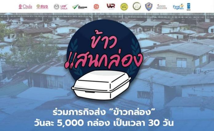สมาคมนิสิตเก่าจุฬาฯ เครือข่าย Food For Fighters และมูลนิธิคุวานันท์ เชิญชวนร่วมภารกิจ “ข้าวแสนกล่อง” เพื่อจัดส่งอาหารปรุงสุกวันละ 5,000 กล่อง รวม 30 วัน และถุงยังชีพ ให้ชาวชุมชนที่กำลังเดือดร้อนทั่วกรุงเทพฯ จำนวนหลายหมื่นคนที่ต้องกักตัวสู้โควิด-19 เพื่อลดความเสี่ยงแพร่เชื้อและลดภาระงานบุคลากรทางการแพทย์