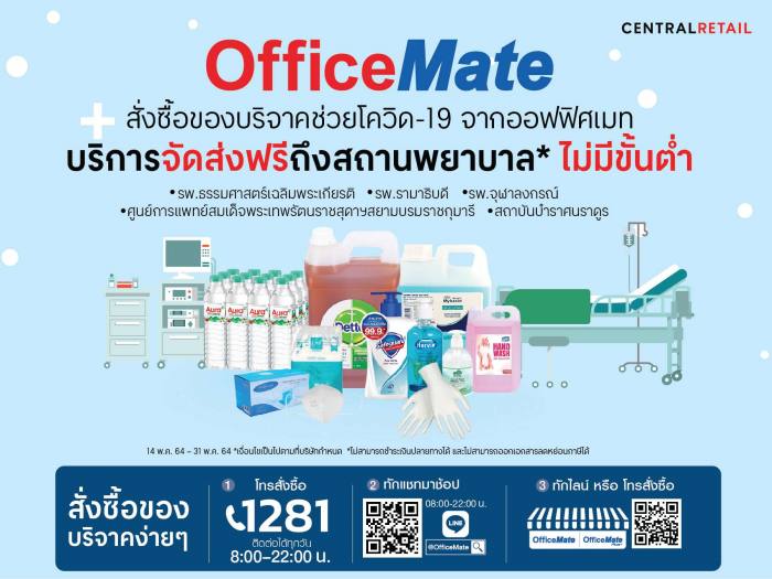 ออฟฟิศเมท ในเครือเซ็นทรัล รีเทล รวมพลังน้ำใจคนไทย “ส่งความห่วงใย สู้ภัย COVID-19” จัดแคมเปญสั่งซื้อของบริจาคช่วยบุคลากรทางการแพทย์ จากออฟฟิศเมท บริการจัดส่งฟรี..!!ถึง5 สถานพยาบาล* แบบไม่มีขั้นต่ำ