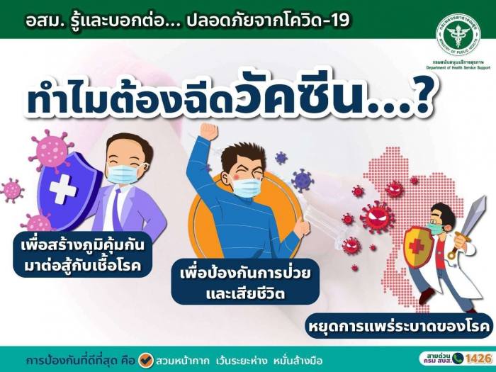 ดังนั้นการฉีดวัคซีนเป็นวาระแห่งชาติ เพื่อให้ประชาชนได้รับวัคซีน เป็นภูมิคุ้มระดับประเทศที่ทำให้ทุกคนปลอดภัย เป็นที่ทราบกันว่า โควิด 19 เป็นเชื้อไวรัสที่ก่อให้เกิดโรคทางเดินหายใจ แพร่เชื้อจากการสัมผัสใกล้ชิดกับผู้ติดเชื้อผ่านสารคัดหลั่ง เช่น น้ำมูก น้ำตา น้ำลาย หรือผ่านละอองฝอยขนาดใหญ่ พบได้ทุกเพศทุกวัย บางคนไม่มีอาการ อาการรุนแรงเล็กน้อย จนถึงอาการรุนแรง มีภาวะแทรกซ้อนและเสียชีวิต อาการที่พบบ่อยคือไอแห้งๆ ต่อเนื่อง จมูกไม่ได้กลิ่น ลิ้นไม่รับรส มีผื่น ท้องเสีย ตาแดง ดังนั้นจึงขอให้ประชาชนอยู่บ้านให้มากที่สุดเพื่อลดการติดเชื้อโควิด19 ส่วนสถานที่ทำงานขอให้เน้นการทำงานที่บ้าน (Work From Home) เพื่อลดความเสี่ยงในการติดเชื้อและไม่นำเชื้อจากนอกบ้านมาแพร่สู่คนในครอบครัว หากจำเป็นต้องเดินทางออกไปทำงานหรือออกไปทำธุระส่วนตัวนอกบ้านให้ปฏิบัติตามมาตรการ D-M-H-T-T-Aอย่างเคร่งครัด สำหรับมาตรการ D-M-H-T-T-A ได้แก่ D : Distancing เว้นระยะระหว่างบุคคล หลีกเลี่ยงการสัมผัสกับผู้อื่น M : Mask wearing สวมหน้ากากอนามัยตลอดเวลา H : Hand washing ล้างมือบ่อย ๆ จัดให้มีจุดบริการเจลล้างมืออย่างทั่วถึงเพียงพอ T : Temperature ตรวจวัดอุณหภูมิร่างกายก่อนเข้าใช้บริการ เพื่อคัดกรองผู้ใช้บริการที่อาจไม่สบาย T : Testing ตรวจหาเชื้อโควิด19 และ A : Application ติดตั้งและใช้แอปพลิเคชัน “ไทยชนะ” และ “หมอชนะ” ก่อนเข้า-ออกสถานที่ทุกครั้ง นอกจากมาตรการต่าง ๆ แล้วการป้องกันที่ได้ผลดีเยี่ยมคือ การฉีดวัคซีนป้องกันโรคโควิด19 ทั้งนี้ประชาชนสามารถสอบถามรายละเอียดเพิ่มเติมได้ที่ กรมสนับสนุนบริการสุขภาพ ได้ที่สายด่วน สบส.คอลเซ็นเตอร์1426 และเว็บไซต์กรมสนับสนุนบริการสุขภาพ https://hss.moph.go.th