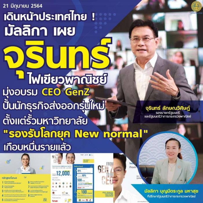 วันที่ 21 มิถุนายน 2564 08.30 น. นางมัลลิกา บุญมีตระกูล มหาสุข ที่ปรึกษารัฐมนตรีว่าการกระทรวงพาณิชย์ เปิดเผยว่า จากรายงานความก้าวหน้าของการติดตามนโยบายนายจุรินทร์ ลักษณวิศิษฏ์ หัวหน้าพรรคประชาธิปัตย์ รองนายกรัฐมนตรีและรัฐมนตรีว่าการกระทรวงพาณิชย์เกี่ยวกับการปรับยุทธศาสตร์รองรับวิกฤติโควิด-19 และรูปแบบการทำธุรกิจและค้าขายยุคใหม่ New normal โดยกรมส่งเสริมการค้าระหว่างประเทศ กระทรวงพาณิชย์นั้น นายจุรินทร์มุ่งเน้นการปั้นนักธุรกิจยุคใหม่ในรั้วมหาวิทยาลัยที่กระทรวงพาณิชย์ดำเนินมาต่อเนื่องหลังรับนโยบายโดยมีเป้าหมายปี 2564 จำนวน 12,000 คน