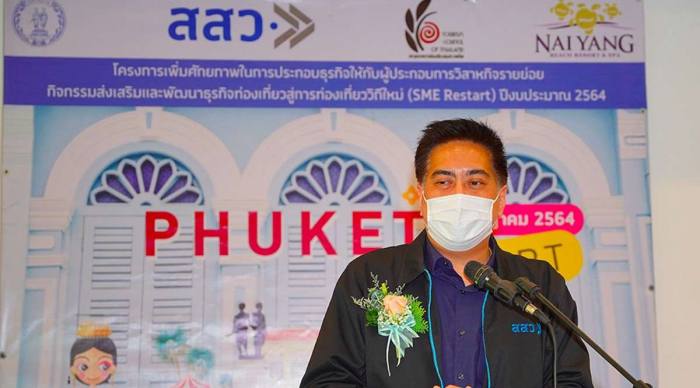 นายณรงค์ วุ่นซิ้ว ผู้ว่าราชการจังหวัดภูเก็ต กล่าวว่า คณะรัฐมนตรีมีมติเห็นชอบเมื่อวันที่ 8 มิถุนายน 2564 ในหลักการแนวทางการเปิดรับนักท่องเที่ยวต่างชาติที่ได้รับการฉีดวัคซีนแล้วจากประเทศที่มีความเสี่ยงต่ำและปานกลางของจังหวัดภูเก็ต (ภูเก็ต แซนด์บ็อกซ์) ตามข้อเสนอของการท่องเที่ยวแห่งประเทศไทย (ททท.) และเริ่มดำเนินการเมื่อวันที่ 1 กรกฎาคม 2564 ที่ผ่านมา ขณะเดียวกันสำนักงานส่งเสริมวิสาหกิจขนาดกลางและขนาดย่อม หรือ สสว. ซึ่งมีบทบาทหน้าที่ในการส่งเสริม พัฒนาและให้ความช่วยเหลือผู้ประกอบการ MSME ได้ร่วมกับ สภาอุตสาหกรรมท่องเที่ยวแห่งประเทศไทย จัดกิจกรรมส่งเสริมและพัฒนาธุรกิจท่องเที่ยวสู่การท่องเที่ยววิถีใหม่ (SME Restart) เพื่อเตรียมความพร้อมให้กับธุรกิจการท่องเที่ยวในจังหวัดภูเก็ต รวมทั้งเพิ่มศักยภาพและพัฒนาทักษะในด้านต่างๆ (Reskill Upskill) ตอบสนองนโยบายดังกล่าวของรัฐบาลอย่างรวดเร็ว จึงนับเป็นเรื่องน่ายินดีอย่างยิ่ง เพราะจะทำให้เกิดต้นแบบองค์ความรู้เกี่ยวกับการท่องเที่ยววิถีใหม่ให้ผู้ประกอบการได้ศึกษาและนำไปปรับใช้ รวมถึงเตรียมความพร้อมเพื่อรับนักท่องเที่ยวต่างชาติที่คาดว่าจะเข้ามาท่องเที่ยวในประเทศกว่า 3 ล้านคน ซึ่งจะสร้างรายได้ขับเคลื่อนเศรษฐกิจให้กับประเทศต่อไป