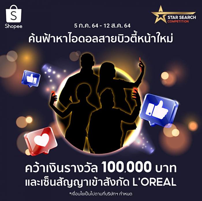 ‘Star Search Competition’ เปิดโอกาสให้ชาวไทยทุกเพศ อายุตั้งแต่ 16 ปี มาโชว์ความสามารถในการไลฟ์สตรีมเพื่อนำเสนอคอนเท้นต์สุดสร้างสรรค์ให้กับผลิต ภัณฑ์และแคมเปญต่างๆ ของแบรนด์ในบริษัท ลอรีอัล ประเทศไทย ผ่านฟีเจอร์ ‘Shopee Live’ โดยผู้ที่ผ่านการคัดเลือกจะได้เข้าร่วมเอ็กซ์คลูซีฟเวิร์คช็อปกับแบรนด์ต่างๆ เช่น L’Oreal Paris, Garnier, Maybelline New York, Biotherm และ IT Cosmetics รวมถึงผู้เชี่ยวชาญด้านไลฟ์สตรีมจากช้อปปี้ และยังได้เซ็นสัญญาร่วมงานกับแบรนด์ในเครือลอรีอัล ประเทศไทย พร้อมรับรางวัลเงินสดรวมมูลค่า 100,000 บาท สามารถสมัครได้ตั้้งแต่วันนี้ – 18 กรกฏาคมนี้
