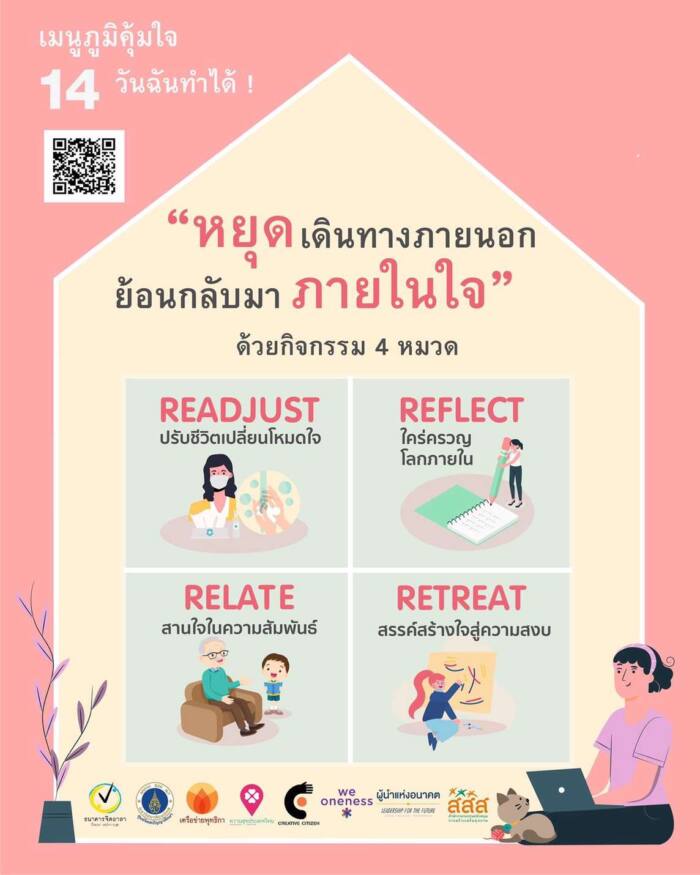 “สสส. และภาคีเครือข่ายเร่งปรับตัวให้เข้าถึงคนทำงานที่บ้านมากยิ่งขึ้น ได้พัฒนากิจกรรมฝึกดูแลจิตใจบนสื่อออนไลน์ “ห้องพักใจ” ผ่านโปรแกรมซูม (Zoom meeting) ตอบโจทย์ความต้องการคนทำงานที่บ้านในสถานการณ์วิกฤต เรียนรู้ทักษะการดูแลร่างกาย จิตใจ เพื่อรับมือกับความเครียดในชีวิตแต่ละวันได้ โดยผู้เข้าร่วมจะได้ฝึกทักษะพื้นฐานเพื่อนำตัวเองออกมาจากความเครียด เปลี่ยนมุมการมองความรู้สึกด้านลบจากปัญญาในชีวิต โดยใช้เวลาเพียง 40 นาทีต่อวัน เป็นระยะเวลา 1 เดือน การจัดกิจกรรมครั้งนี้มุ่งเป้าหมายให้คนทำงานที่บ้านเข้าร่วม 1 หมื่นคน” ดร.นพ.ไพโรจน์ กล่าว