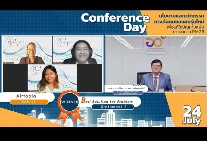 ทั้งนี้ ภายในงานยังมีการมอบรางวัลชนะเลิศ 3 รางวัล ได้แก่ 1.ทีม Dustappear ผลงานศูนย์บริหารสถานการณ์ฝุ่นละอองขนาดเล็ก (ศบฝ.) และแอปพลิเคชัน “ไทยสู้ฝุ่น” ตั้งตลาดคาร์บอนภาคบังคับ (Mandatory carbon market) และภาษี Green Area 2.ทีม Airtopia ผลงาน PM2.5 Smart Tracking จัดสรรสิทธิ (PM2.5 เครดิต) ใช้ลดภาษี 3. ทีมทางของฝุ่น ผลงาน Inclusive sustainable area development แนวทางการสร้างพื้นที่สีเขียวในชุมชนเมือง และรางวัลชมเชย 26 รางวัล