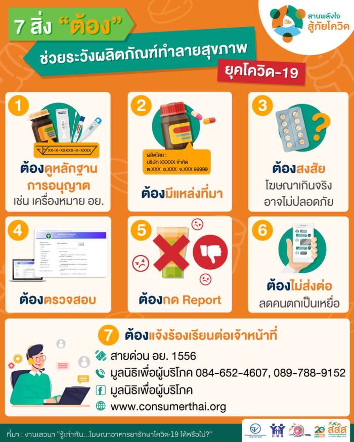 ทั้งนี้ ผู้ที่ต้องการแจ้งร้องเรียนผลิตภัณฑ์สุขภาพโฆษณาเกินจริง โทรศัพท์มาที่มูลนิธิเพื่อผู้บริโภค 084-652-4607, 089-788-9152 สายด่วน อย. 1556 ติดตามและสอบถามข้อมูลการโฆษณาผลิตภัณฑ์สุขภาพเพิ่มเติมได้ตลอด 24 ชั่วโมง ที่เฟซบุ๊กแฟนเพจมูลนิธิเพื่อผู้บริโภค และเว็บไซต์ www.consumerthai.org