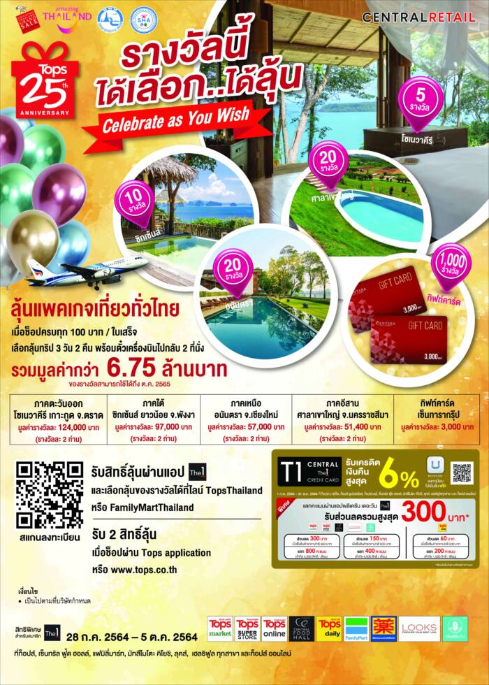 19 สิงหาคม 2564, กรุงเทพฯ : เพราะเข้าใจดีว่าทุกคนต่างคิดถึงทริปท่องเที่ยวที่ห่างหายไปนาน “ท็อปส์ และ แฟมิลี่มาร์ท” ในเครือเซ็นทรัล รีเทล ชวนทุกคนมาช้อปแล้วลุ้นรับแพคเกจท่องเที่ยวสุดหรูให้คลายความคิดถึง ช้อปแล้วลุ้นรอไว้ก่อนพร้อมเดินทางได้เมื่อไหร่เก็บกระเป๋าเตรียมบินแบบฟินๆ กับ ทริปที่พักสุดหรูทั่วไทย ในแคมเปญฉลองท็อปส์ครบรอบ 25 ปี “รางวัลนี้ได้เลือกได้ลุ้น” แพ็คเกจท่องเที่ยว 3 วัน 2 คืน พร้อมตั๋วเครื่องบินไปกลับ 2 ที่นั่ง รวมมูลค่ากว่า 6.75 ล้านบาท ให้คุณได้สัมผัสประสบการณ์สุดเอ็กซ์คลูซีฟ ดื่มด่ำบรรยากาศ พักกาย พักใจที่โรงแรมหรู