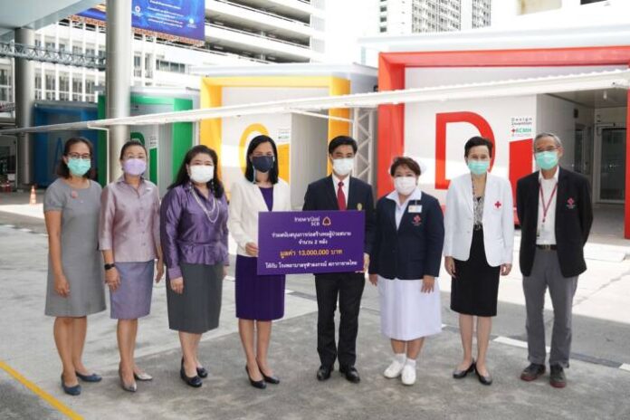ธนาคารไทยพาณิชย์ร่วมบรรเทาวิกฤตโควิด-19 สนับสนุนการก่อสร้างหอผู้ป่วยสนาม โรงพยาบาลจุฬาลงกรณ์ สภากาชาดไทย จำนวน 2 หลัง รวมมูลค่า 13 ล้านบาท ณ บริเวณลานจอดรถหน้าอาคารแพทยพัฒน์ เพื่อรองรับผู้ป่วยโควิด-19 กลุ่มสีเหลืองที่มีอาการขั้นกลางไม่สามารถช่วยเหลือตัวเองได้จนถึงผู้ป่วยกลุ่มวิกฤตที่มาใช้บริการที่โรงพยาบาลจุฬาลงกรณ์และรอเตียงเพื่อเข้ารับการรักษา ซึ่งมีจำนวนเพิ่มขึ้นอย่างต่อเนื่อง โดยมี ศ.นพ.สุทธิพงศ์ วัชรสินธุ ผู้อำนวยการโรงพยาบาลจุฬาลงกรณ์ รับมอบจาก นางอภิพันธ์ เจริญอนุสรณ์ ผู้จัดการใหญ่ ธนาคารไทยพาณิชย์ โดยมีนางสาวอารยา ภู่พานิช รองผู้จัดการใหญ่ ผู้บริหารสายงานกิจกรรมเพื่อสังคม ธนาคารไทยพาณิชย์ ผศ.พญ.ยุวรีย์ พิชิตโชค รองผู้อำนวยการฝ่ายยุทธศาสตร์องค์กรและทรัพยากรบุคคล ศ.ดร.เสริชย์ โชติพานิช รองผู้อำนวยการฝ่ายกายภาพ โรงพยาบาลจุฬาลงกรณ์ ร่วมด้วย ณ โรงพยาบาลจุฬาลงกรณ์ หอผู้ป่วยสนามดังกล่าวจะสามารถรองรับผู้ป่วยได้หลังละ 15 เตียง ภายในหอผู้ป่วยประกอบด้วย พื้นที่พักผู้ป่วยที่มีความดันอากาศเป็นลบ ห้องทำงานพยาบาลและแพทย์ พื้นที่เก็บวัสดุการแพทย์ ห้องน้ำ ห้องเปลี่ยนชุด PPE ระบบกล้องวงจรปิดติดตามผู้ป่วย ตัวอาคาร ประกอบด้วย ระบบปรับอากาศ ระบบระบายอากาศที่สร้างความดันลบพร้อมตัวกรองอากาศชนิด HEPA filter ระบบก๊าซทางการแพทย์ และ Medical vacuum ระบบกล้องวงจรปิดเพื่อติดตามผู้ป่วย ฯลฯ