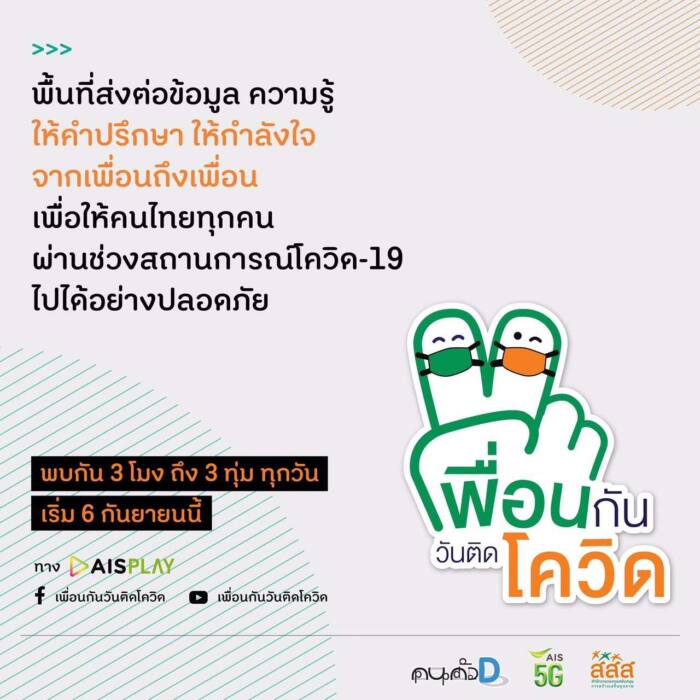 สสส.-กลุ่มคนตัวD-AIS เปิดช่องรายการ “เพื่อนกัน วันติดโควิด” ส่งต่อข้อมูลสุขภาพ-วิธีดูแลตัวเอง เยียวยาจิตใจกลุ่มผู้ป่วยโควิด-คนใกล้ชิดใน Home-Community Isolation ผ่านเฟซบุ๊ก ยูทูบ เพื่อนกันวันติดโควิด และ AIS PLAY เริ่ม 6 ก.ย. 64 ทุกวันจันทร์-อาทิตย์ บ่าย 3 ถึง 3 ทุ่ม คาดเข้าถึง 6 ล้านคน