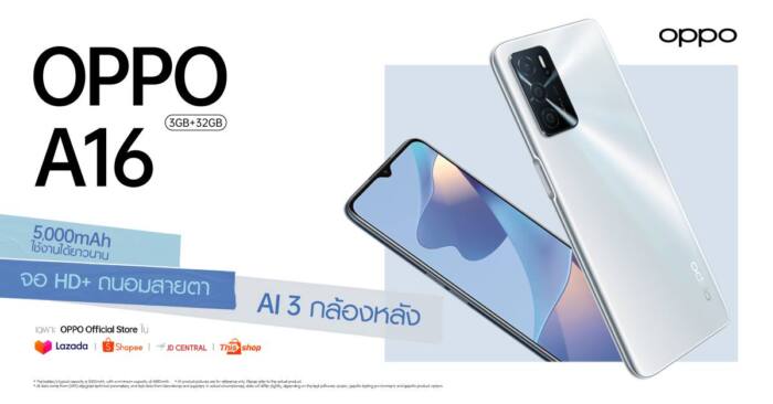 OPPO แบรนด์สมาร์ทโฟนชั้นนำในไทย พร้อมวางจำหน่าย OPPO A16 รุ่น RAM 3GB + ROM 32GB บนทุกช่องทางออนไลน์เพื่อสอดรับกับพฤติกรรมการบริโภคของผู้ใช้ OPPO ให้ครอบคลุมและทั่วถึงมากยิ่งขึ้น โดยสามารถเป็นเจ้าของ OPPO A16 รุ่น RAM 3GB + ROM 32GB ได้แล้ววันนี้ ในราคา 4,799 บาท ที่ OPPO Official Store บน Lazada, Shopee, JD Central และ Thisshop