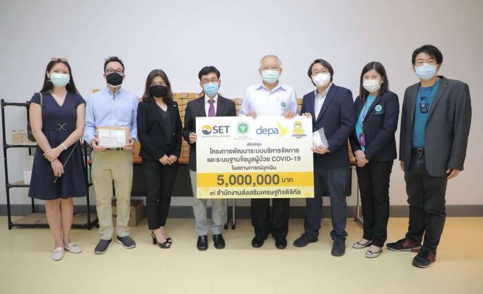 14 กันยายน 2564: จังหวัดนนทบุรี – ดร.กฤษฎา เสกตระกูล รองผู้จัดการ สายงานพัฒนาความยั่งยืนตลาดทุน และ นางลดาวัลย์ กันทวงศ์ ผู้อำนวยการอาวุโส ฝ่ายบริหารกิจกรรมเพื่อสังคม ตลาดหลักทรัพย์แห่งประเทศไทย (ตลท.) เป็นผู้แทนตลาดหลักทรัพย์แห่งประเทศไทยในการส่งมอบเงินสนับสนุนแก่สำนักงานส่งเสริมเศรษฐกิจดิจิทัล หรือ ดีป้า โดยมี ดร.ชินาวุธ ชินะประยูร ผู้ช่วยผู้อำนวยการใหญ่ เป็นผู้รับมอบ เพื่อใช้ในการดำเนินโครงการพัฒนาระบบบริหารจัดการและระบบฐานข้อมูลผู้ป่วย COVID-19 ในสถานการณ์ฉุกเฉินของกลุ่มดิจิทัลสตาร์ทอัพอาสา เป็ดไทยสู้ภัย ณ จุดบรรจุยา สถาบันทันตกรรม กรมการแพทย์ กระทรวงสาธารณสุข โดยมี นายแพทย์มานัส โพธาภรณ์ รองอธิบดีกรมการแพทย์ และ ดร.พณชิต กิตติปัญญางาม หัวหน้ากลุ่มสตาร์ทอัพอาสา เป็ดไทยสู้ภัย ร่วมเป็นสักขีพยาน