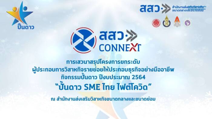 โดยได้มีการจัดการเสวนาสรุปโครงการยกระดับผู้ประกอบการวิสาหกิจรายย่อยให้ประกอบธุรกิจอย่างมืออาชีพกิจกรรมปั้นดาว ปีงบประมาณ 2564 “ปั้นดาว SME ไทย ไฟต์โควิด” ผ่านระบบออนไลน์ และเผยแพร่ผ่าน Facebook สสวconnext-ตลาดออนไลน์ ผู้สนใจสามารถรับชมได้ที่ https://www.facebook.com/smeconnextonlinemarket/videos/1554249208300958