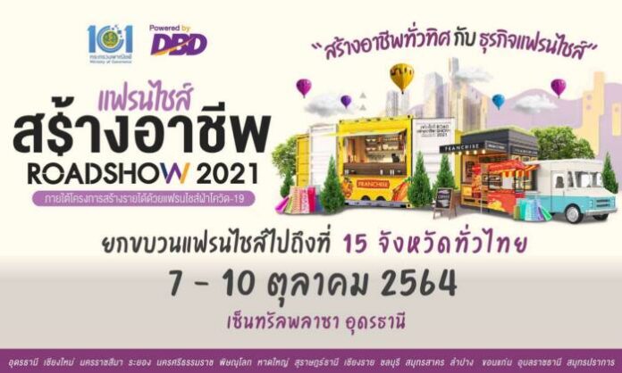 กรมพัฒนาธุรกิจการค้า กระทรวงพาณิชย์ จึงขอเชิญร่วมกิจกรรม แฟรนไชส์สร้างอาชีพ Road Show 2021 ยกขบวนแฟรนไชส์มาเป็นทางเลือกในการสร้างอาชีพสร้างรายได้ เพื่อช่วยเหลือผู้ที่ได้รับผลกระทบจากวิกฤตการณ์แพร่ระบาดของเชื้อไวรัสโควิด -19 ภายในงานพบกับแฟรนไชส์หลากหลายแบรนด์ให้เลือกสรร รวมทั้งกิจกรรมที่น่าสนใจอีกมากมาย สำหรับผู้ที่สนใจและผู้ที่ต้องการสร้างอาชีพสร้างรายได้ด้วยแฟรนไชส์ ส่งเสริมให้เกิดการกระจายรายได้สู่ท้องถิ่น โดยจัดขึ้นแห่งแรกที่ เซ็นทรัล พลาซ่า อุดรธานี ระหว่างวันที่ 7-10 ตุลาคม ทั้งนี้สามารถสอบถามเพิ่มเติมได้ที่ กรมพัฒนาธุรกิจการค้า สายด่วน 1570.